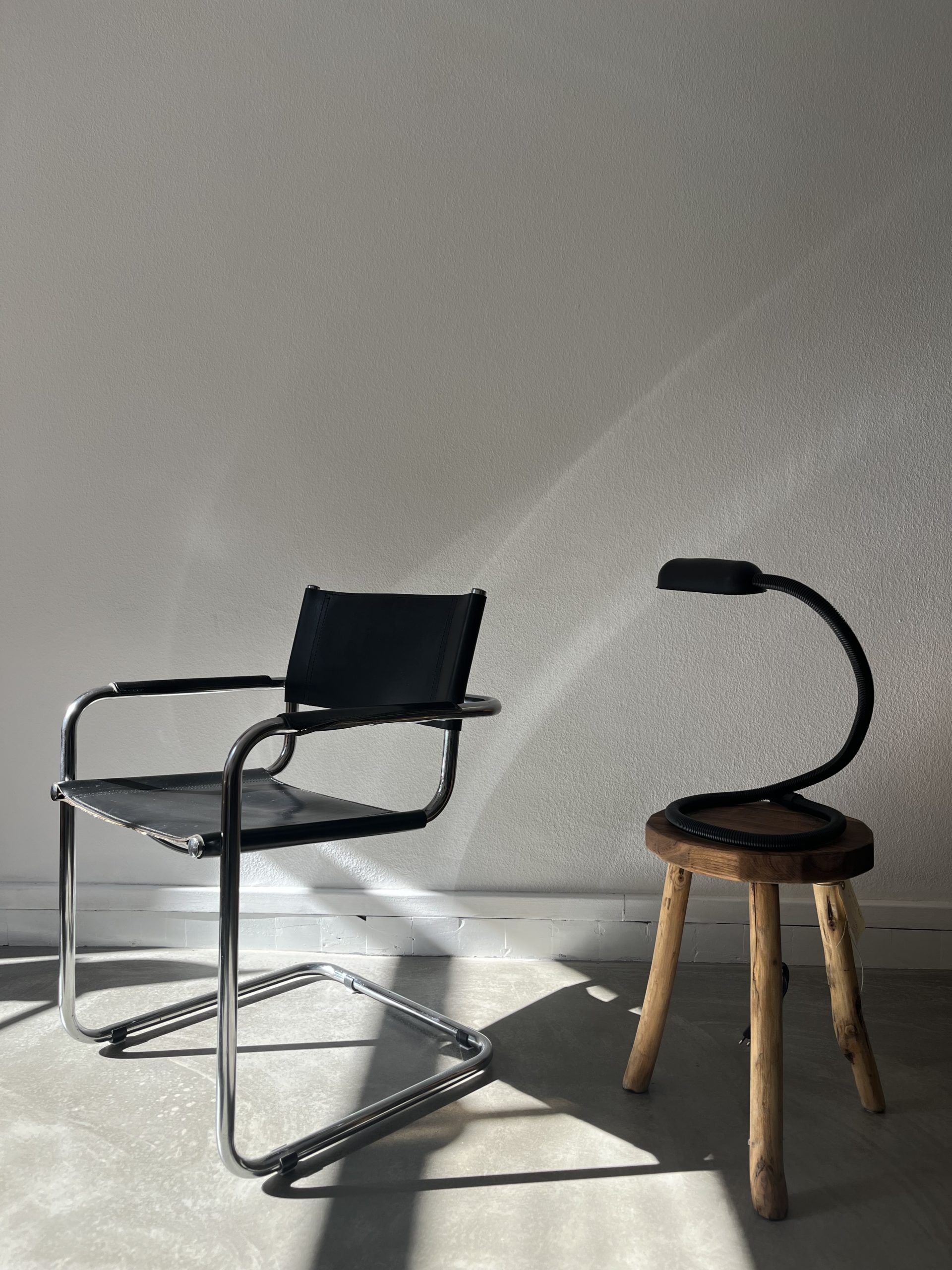 Chaise style bauhaus structure tubulaire acier chromé et cuir noir Victoria Möbel Suisse 1970s P48 L51 Ha43 Hacc.66 cm