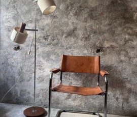 Chaise à accoudoirs cantilever tubulaire chrome et cuir naturel patiné (doublure dessous craquelée mais cuir assise intact)