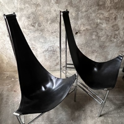 Rare : fauteuil modèle « inka » design C. & L. Andersson Suède 1980 cuir teinté bio noir et acier chromé - inspiré des hamacs sud américains 128H 88L 94P cm // 2 PIÈCES DISPONIBLES