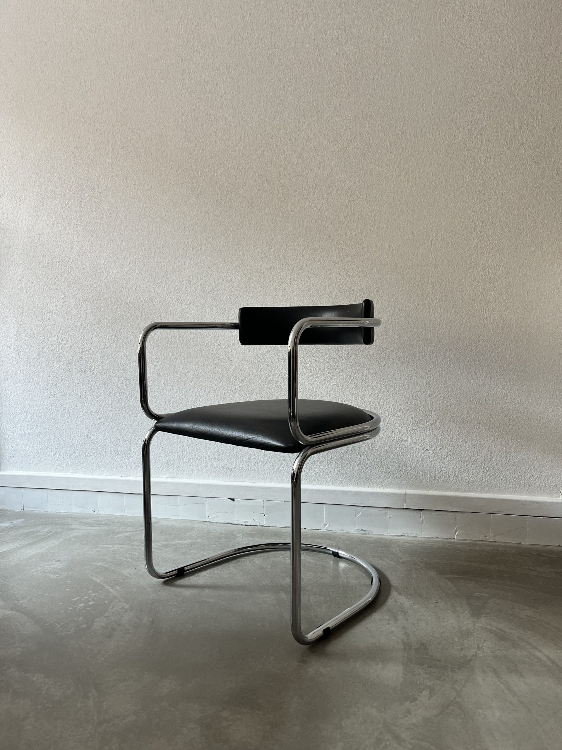 Chaise style bauhaus structure tubulaire acier chromé et cuir noir Victoria Möbel Suisse 1970s P48 L51 Ha43 Hacc.66 cm