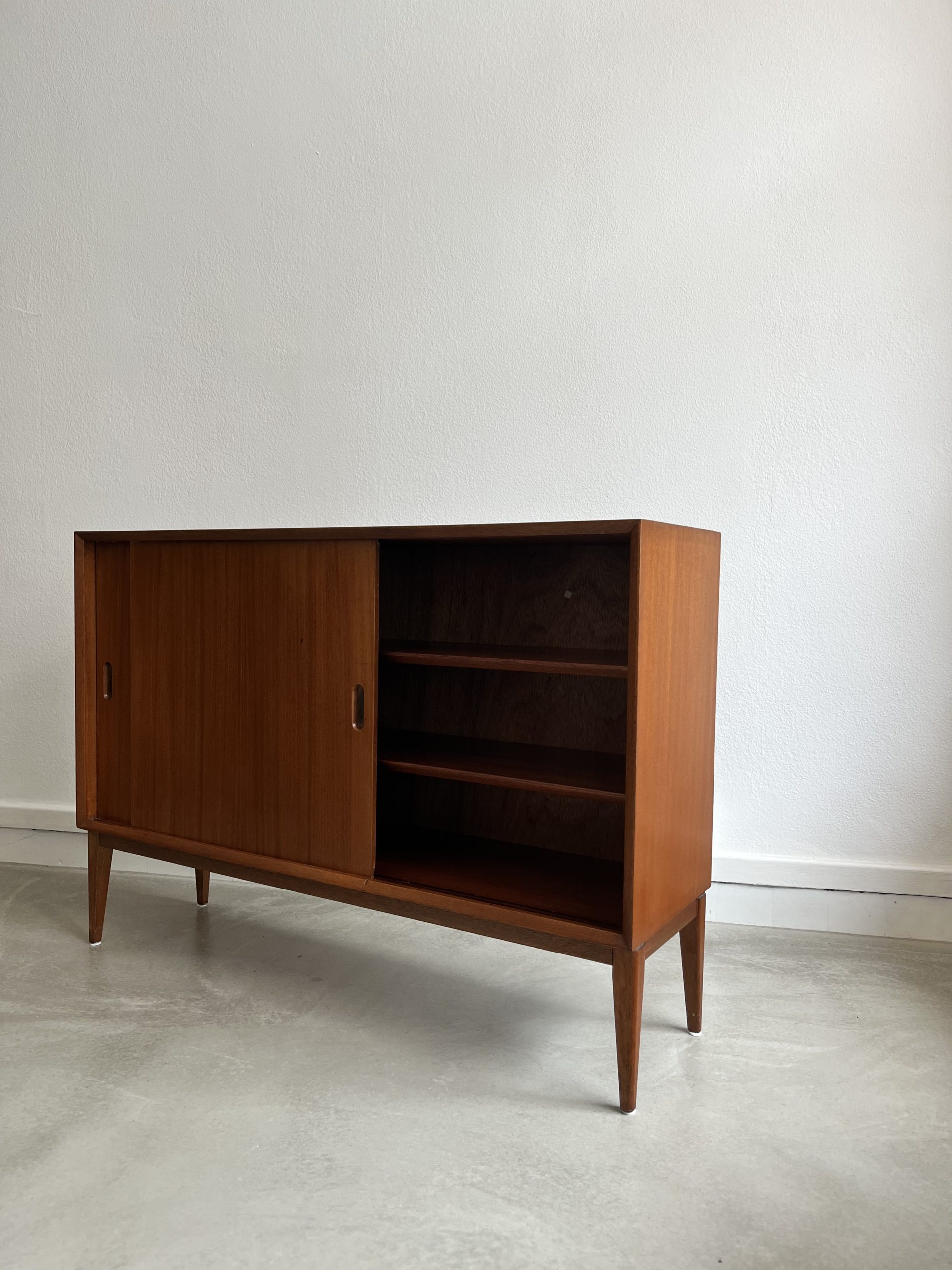 Petite enfilade style scandinave en teck (y.c. Paroi arrière) vers 1960 portes coulissantes, 2 étagères 30x102 H70 cm