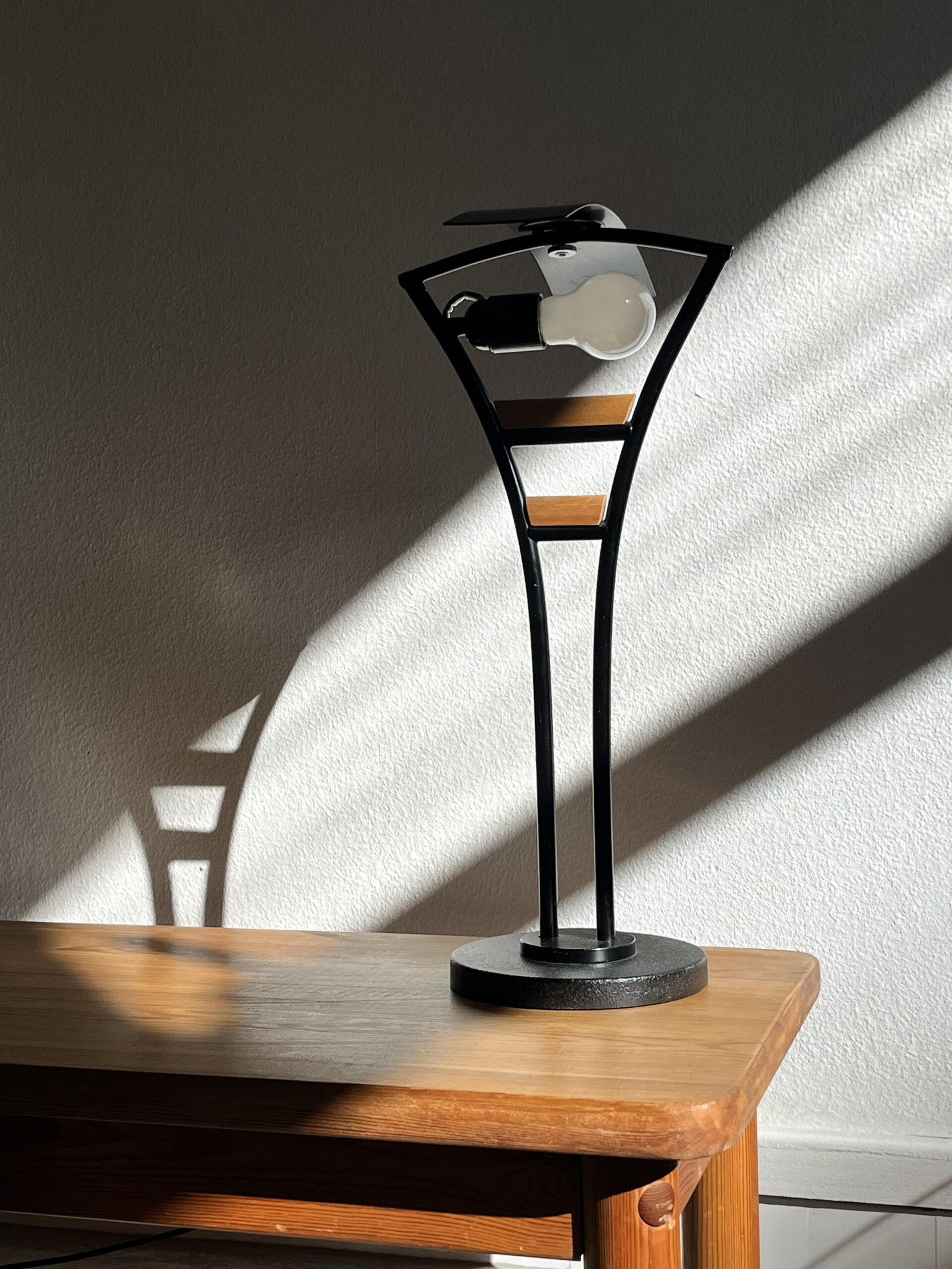 Lampe bois teinté & 4 boules verre (fumé et incolore) 1970 Suisse design Léo Walser Schweizer Electronics avec variateur h.62 l.47 cm